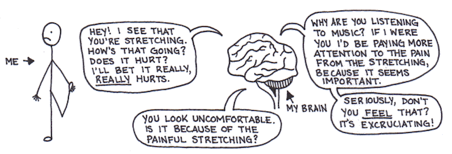 Apparently (according to a small amount of internet research, and slightly larger amount of talking to my friends who also have ADD, or who have kids who have ADD) the stretching thing is actually fairly common. Physical discomfort is just one of the things that people with ADD zero in on against our will; it's the reason we get fidgety when we have to sit still for a long time, especially while wearing uncomfortable clothes.