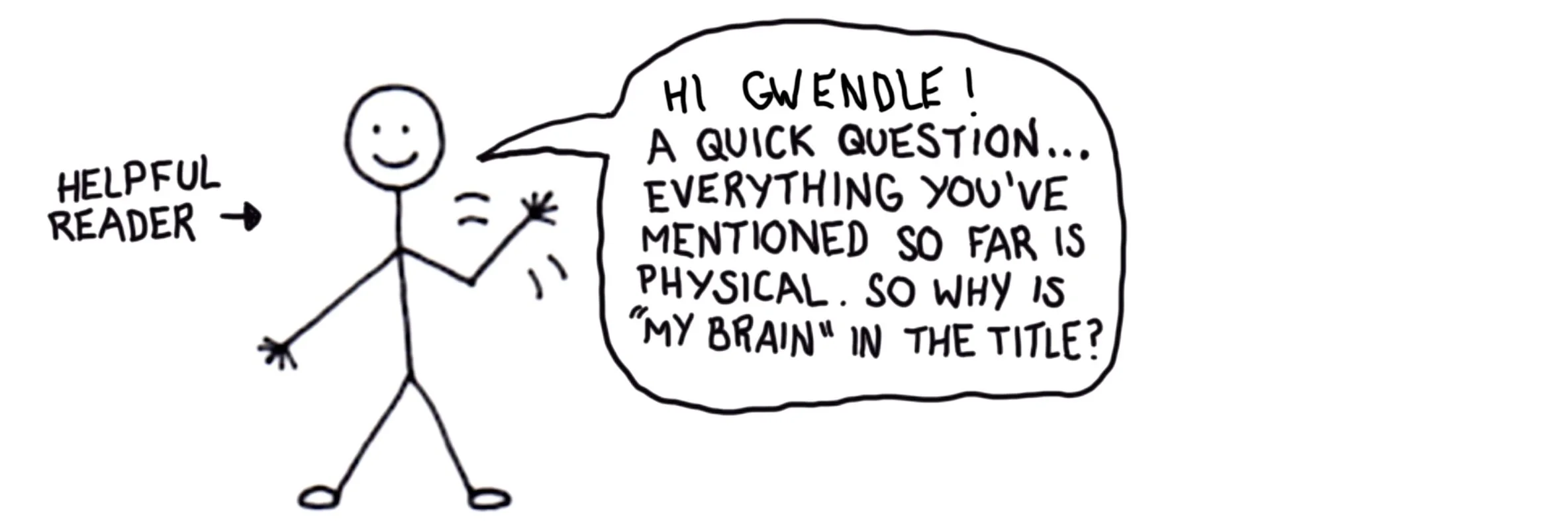 This symptom of My Brain feeling alienated from my hand has the potential to increase pain and other neurological symptoms, and to hamper my progress in all of my more physical therapies. So we use mirror therapy to trick My Brain into believing that my right hand is just as healthy and mobile and pain-free as my left hand.